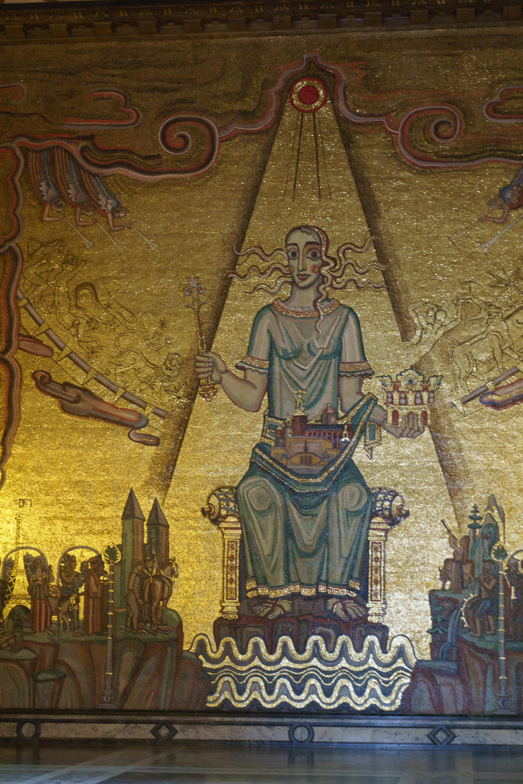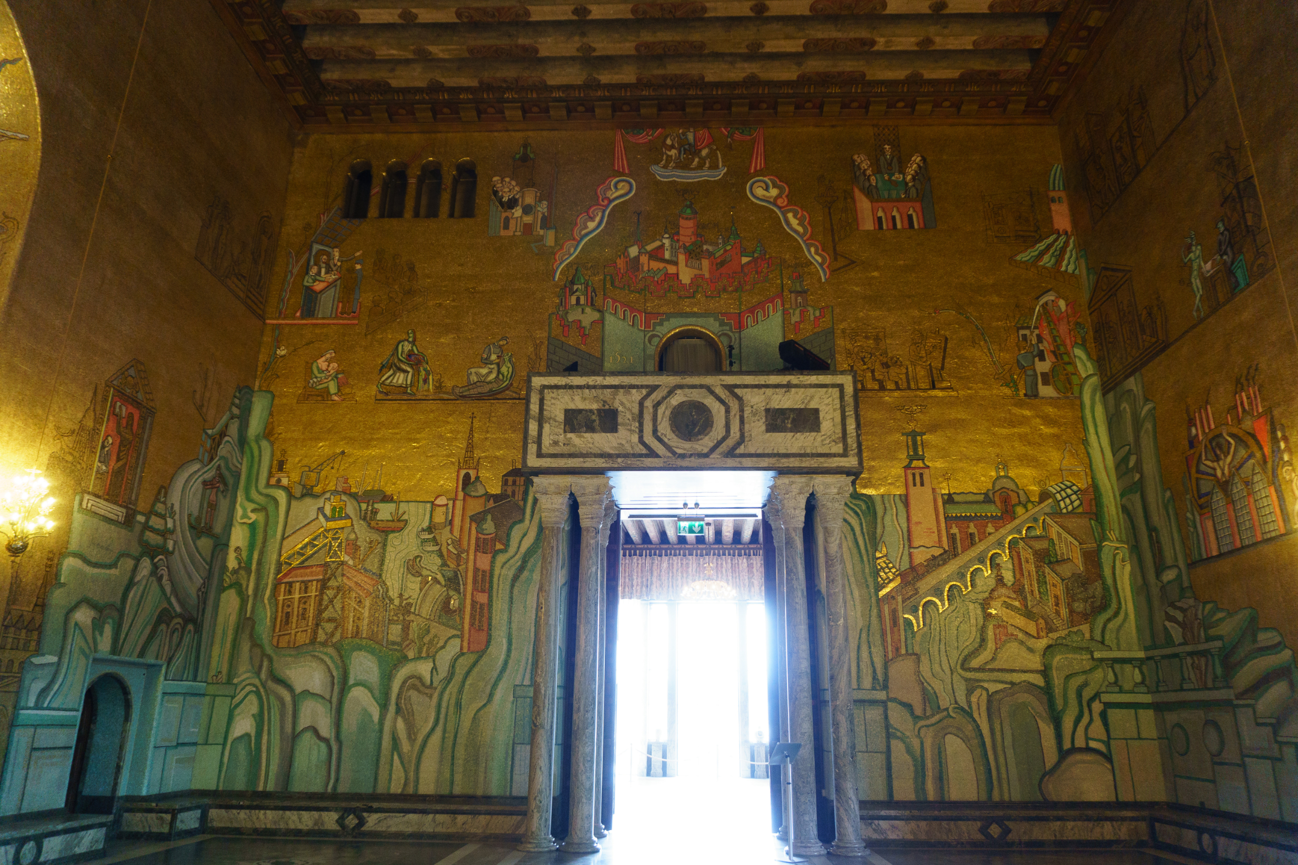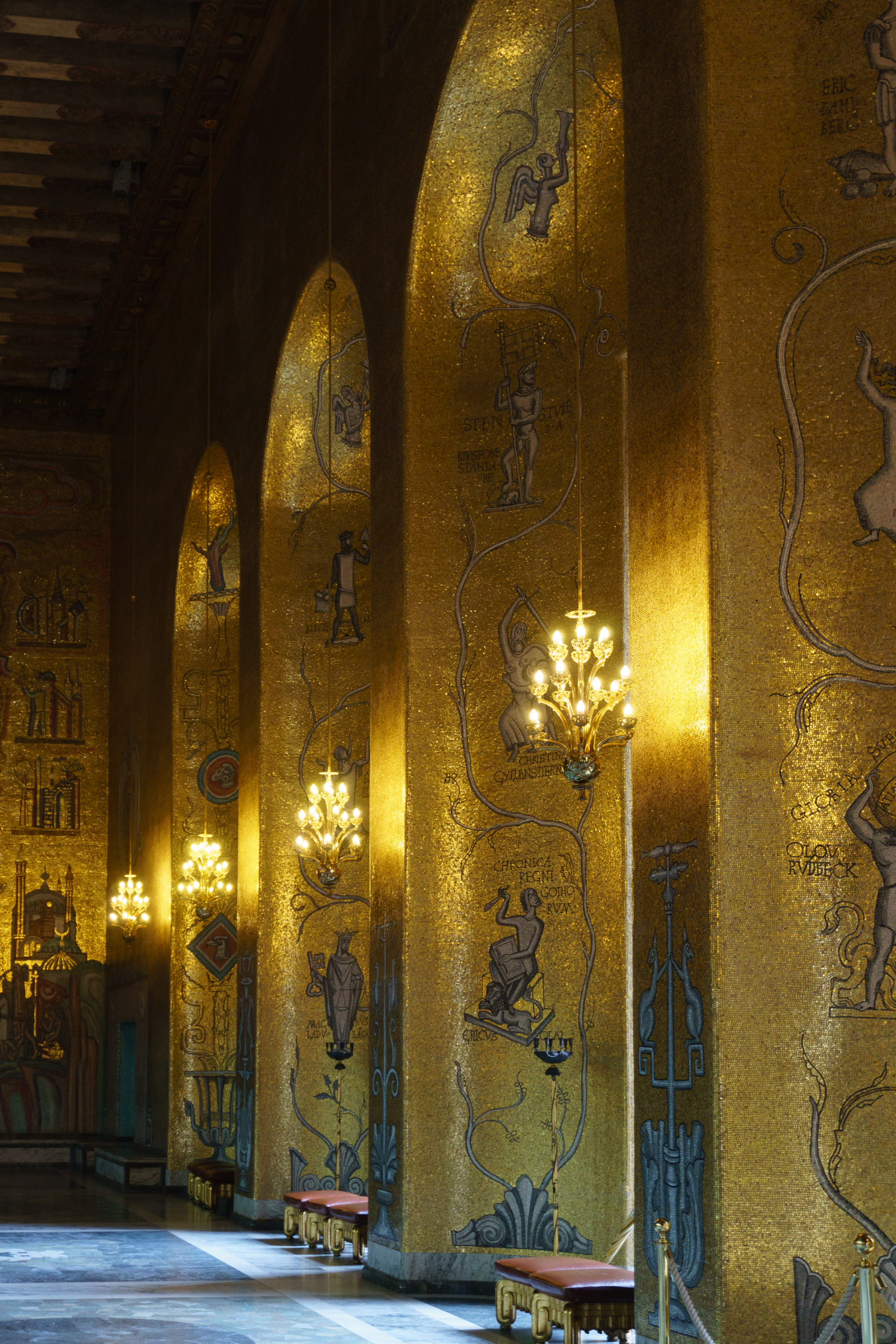 Золотой зал украшает мозаика из более чем 18 млн позолоченных плиток, изображающая сцены из истории Швеции. Интересно, что на изображениях очень много исторических ошибок, проигравшие--побеждают, даты перепутан. Вообщем историю учить в этом зале опасно.