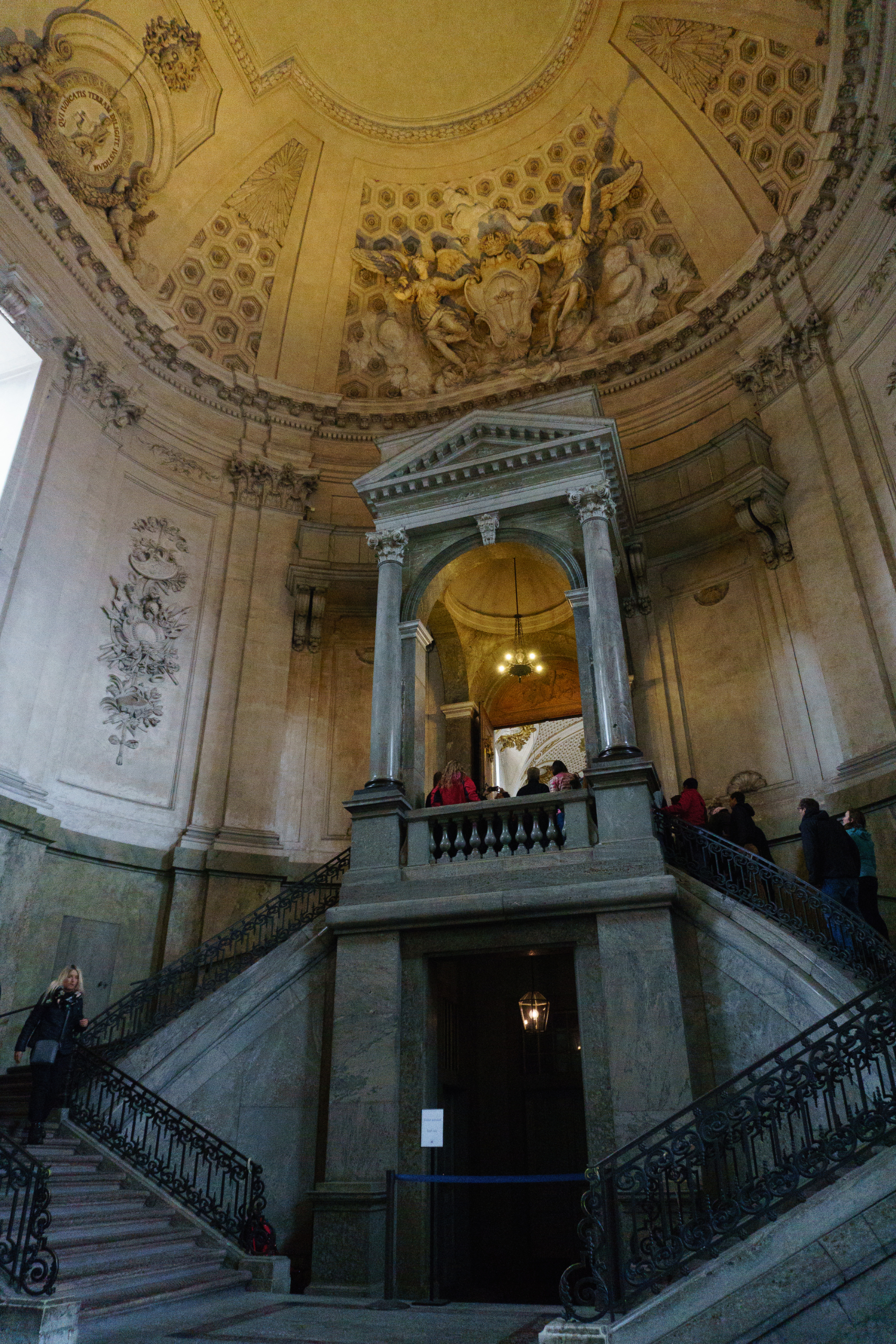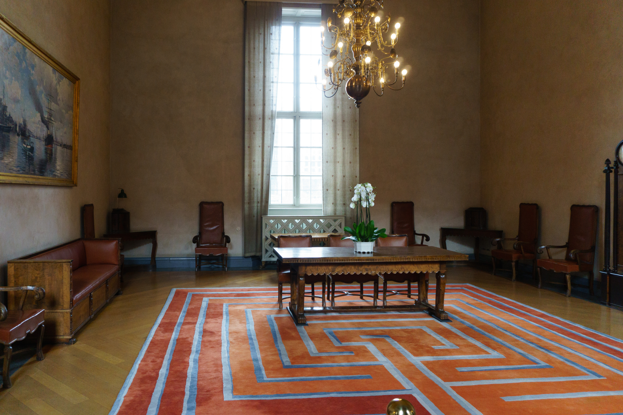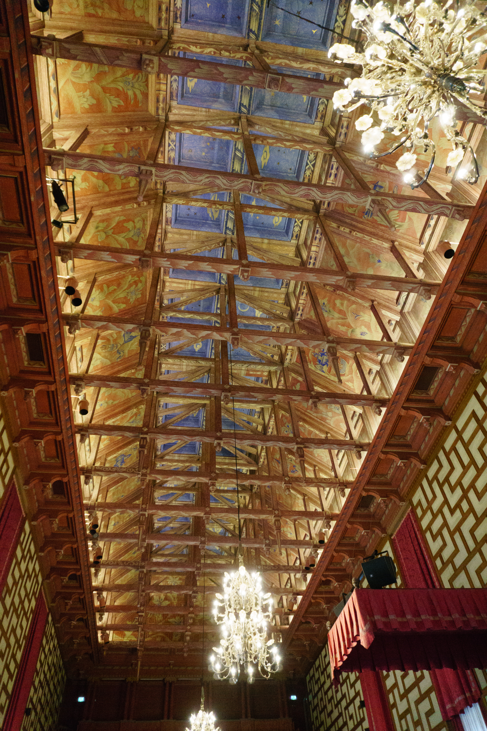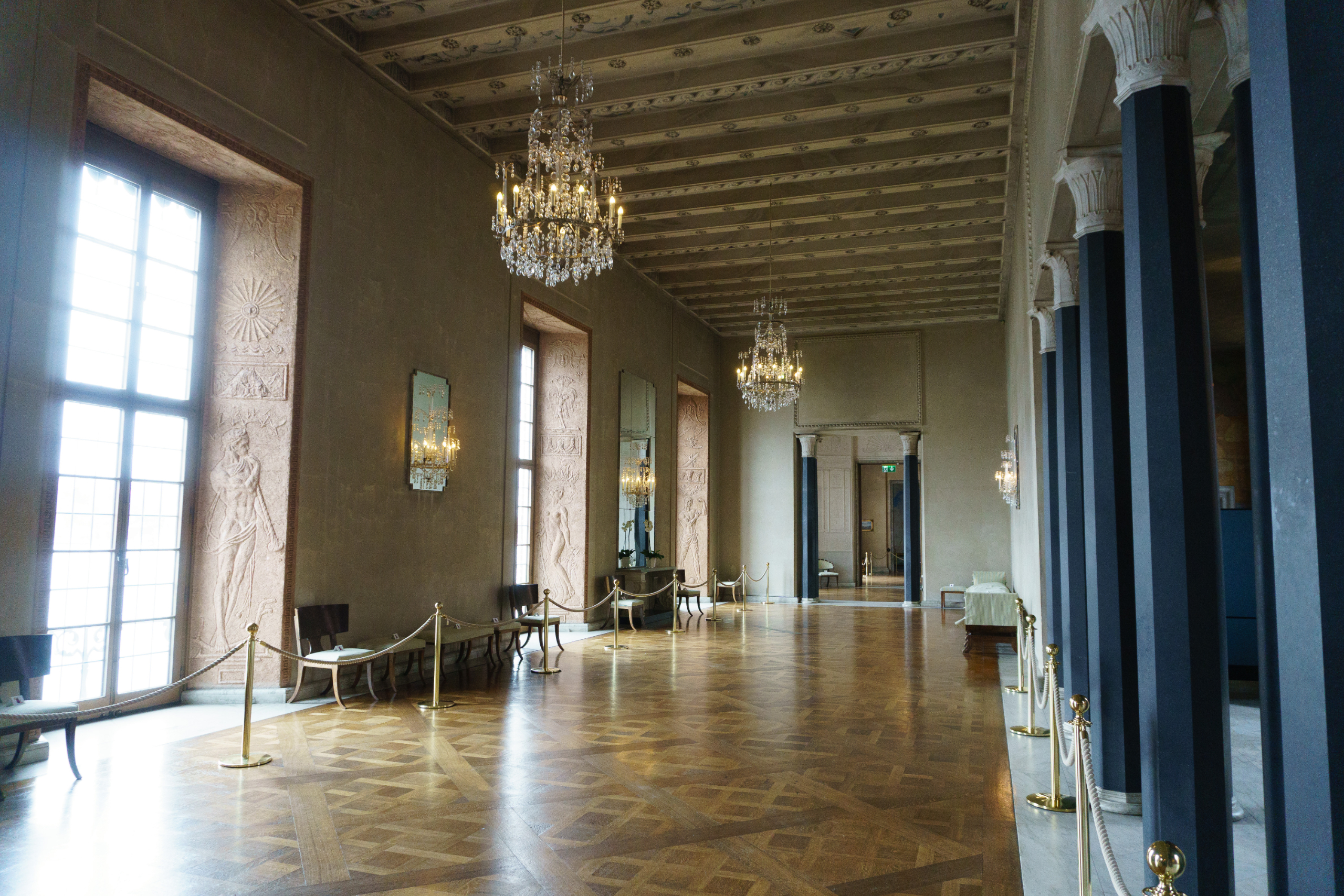 Золотой зал украшает мозаика из более чем 18 млн позолоченных плиток, изображающая сцены из истории Швеции. Интересно, что на изображениях очень много исторических ошибок, проигравшие--побеждают, даты перепутан. Вообщем историю учить в этом зале опасно.