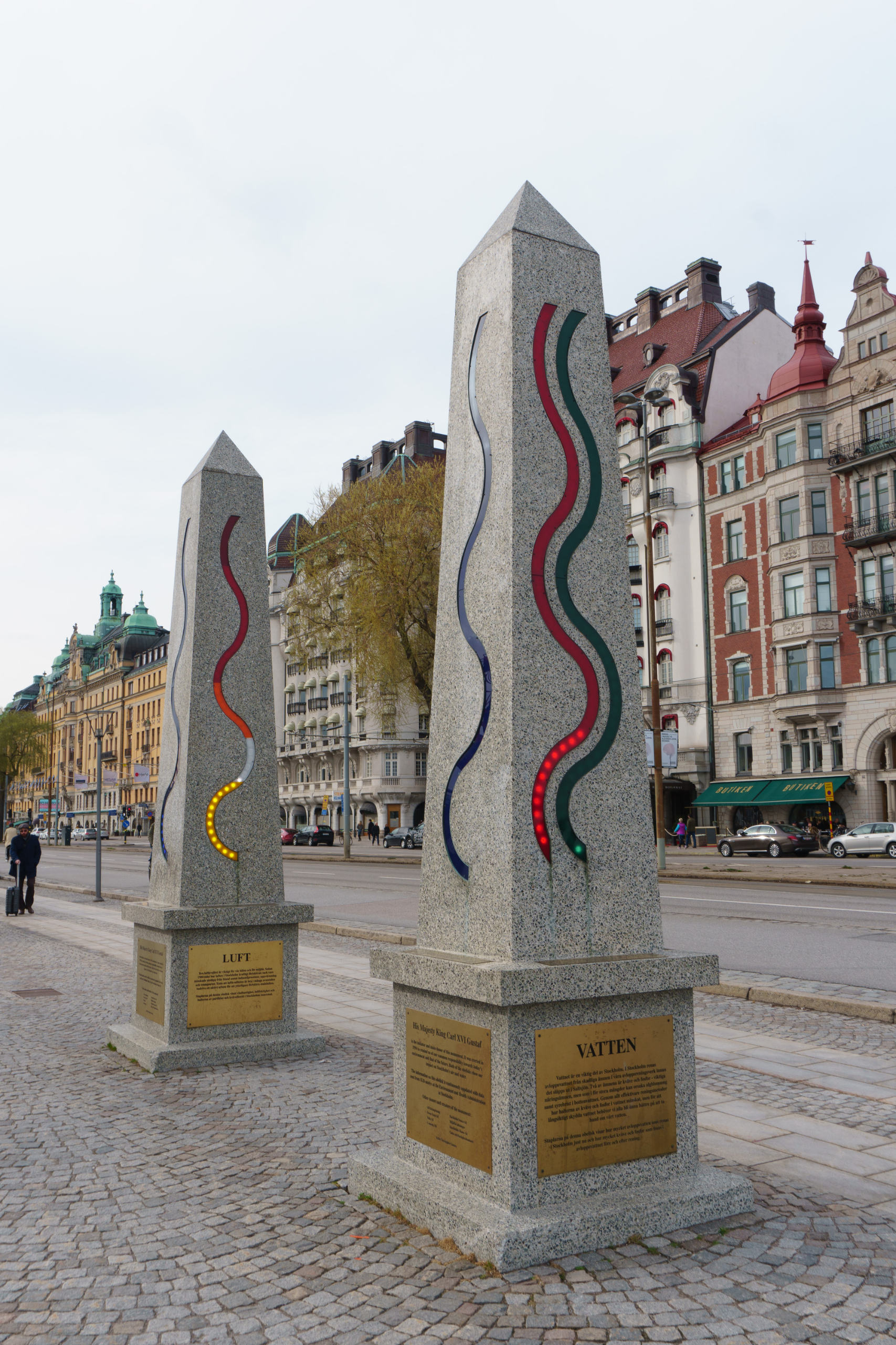 Памятники Воздуху и Воде, которые в Стокгольме уникально чистые. С разных сторон обелисков волнистыми линиями загораются лампочки, показывая текущие замеры чистоты или загрязнения.