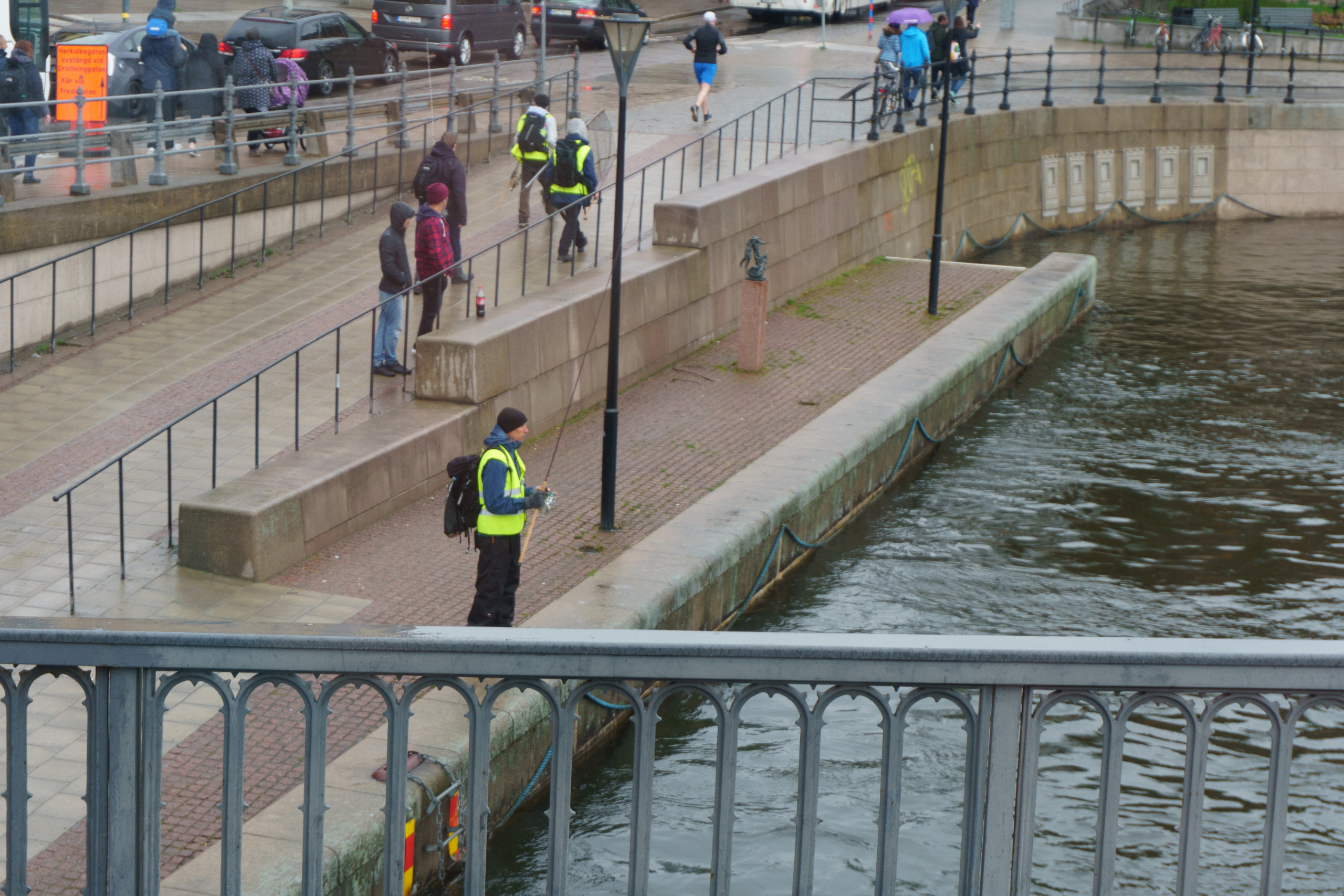 На улице дождь и холодно, но по всей набережной много рыбаков. В городе проходит соревнование по отлову рыбы. (Фото специально для тех, кого смутило отсутствие рыбаков в Берне.)